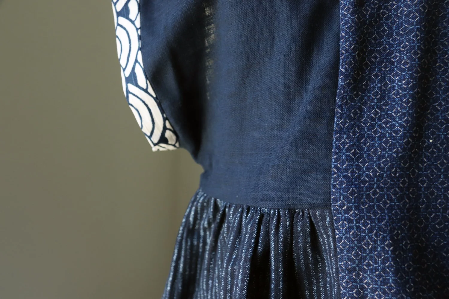 Do you remember this dress? The intention was always for it to be made out of different prints. The dark blue base of each one creates a harmony for the mixing and matching of all those prints. The dress turned out so well but there were a lot of scraps left over when we were finished. So many scraps that we were able to remove the bottom band and replace it with a wider one and still have enough left to make another whole outfit.