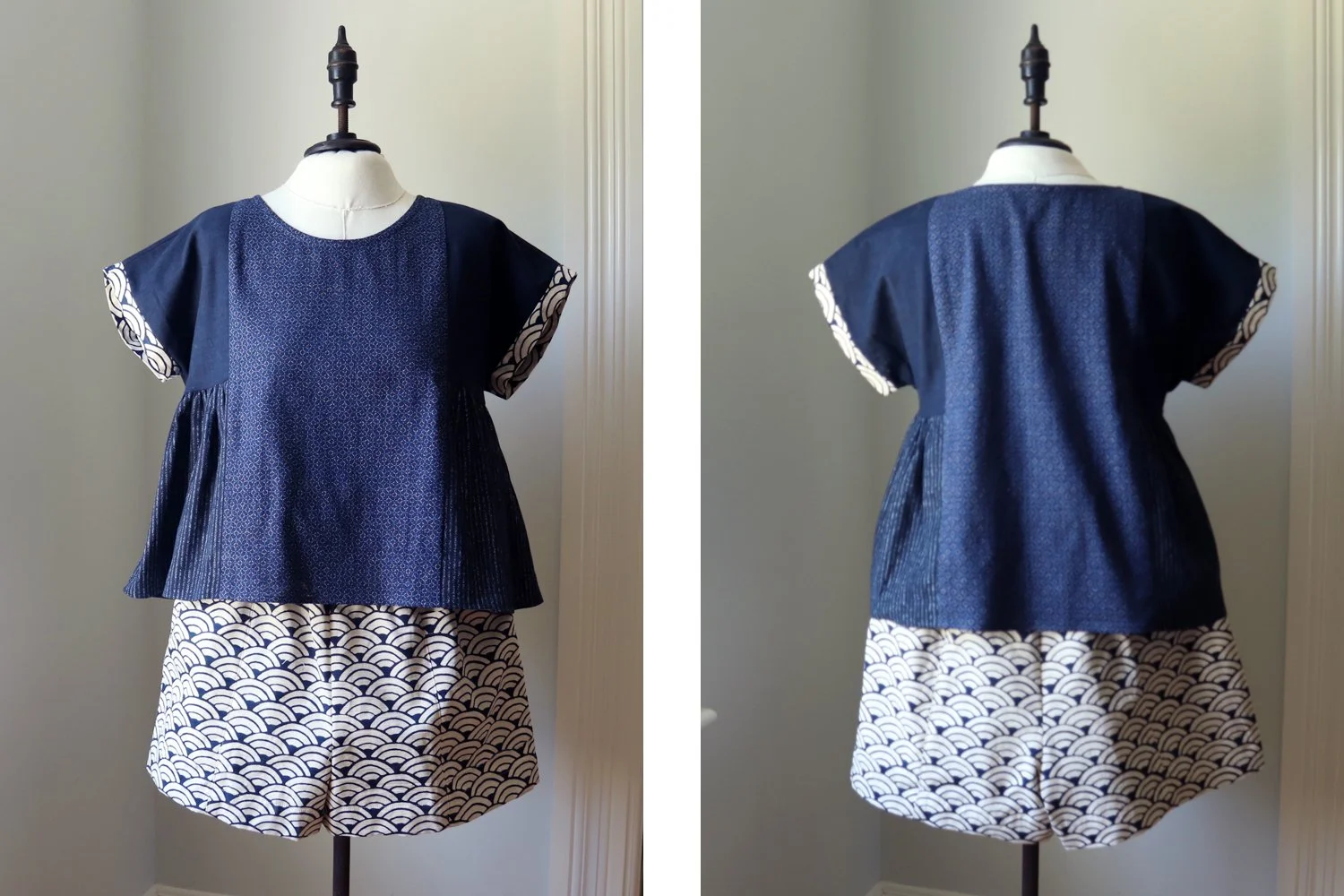 Enter the Matchy Matchy Sewing Club. They have created an entire line of patterns dedicated to solving the eternal scrap pile dilemma. While being excellent scrap busters, their patterns are also very thoughtful, modern and a lot of fun to wear. #friendolywardrobe thought this would be the perfect answer for all of those beautiful scraps and she was so right! We paired the Collage Gather Top with the Weekend Chore Shorts to come up with this summer set.