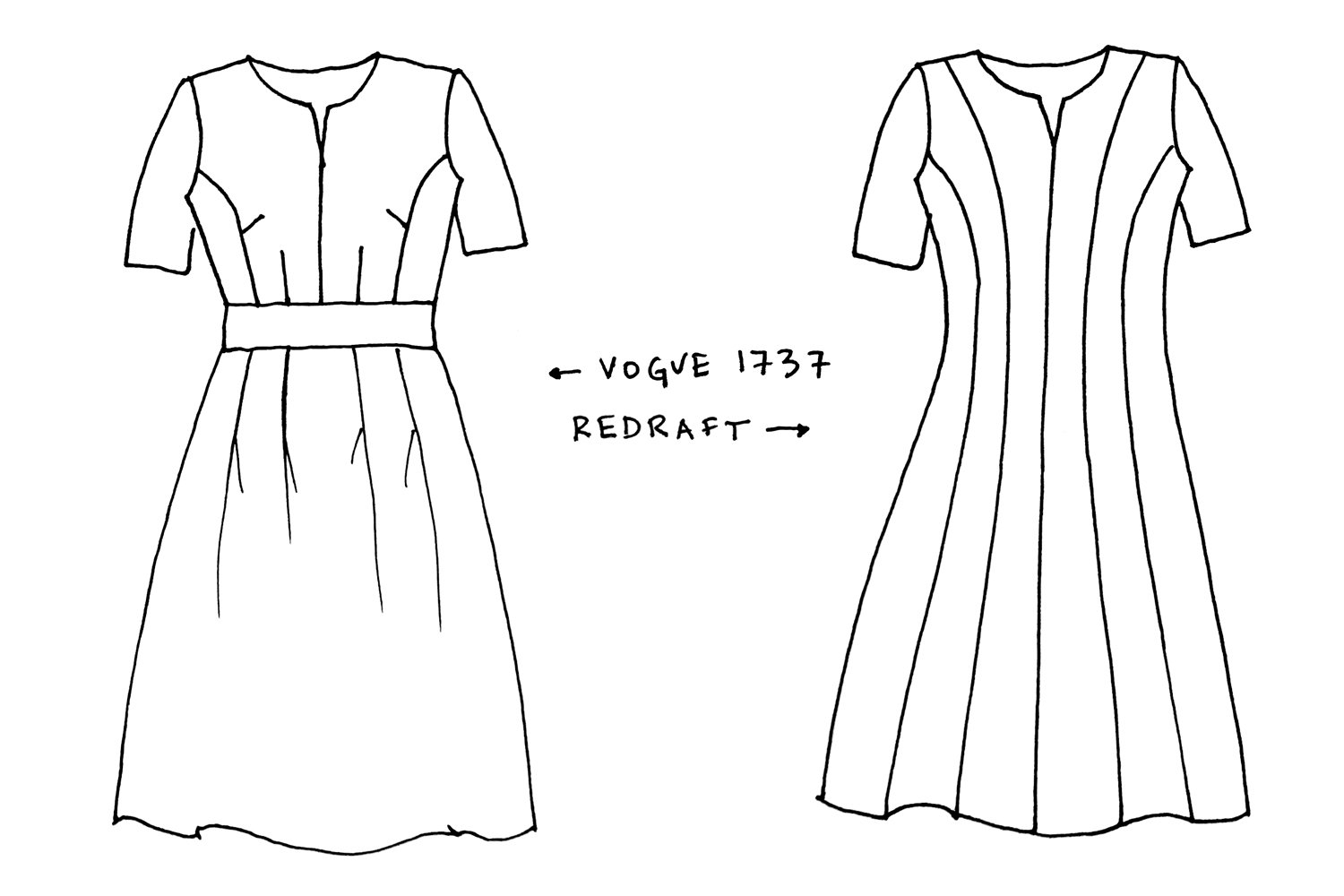We started with Vogue 1737. It’s a beautiful pattern on it’s own but it still wasn’t exactly what she had in mind. She loved the neck detail, the short sleeves and the overall silhouette of the dress. We removed the waistband, changed the skirt pleats into seams and extended them into the corresponding dart or seam in the bodice. In the end, it’s a twelve panel dress that skims her body perfectly (she’s tinier than I am so the dress is pretty snug on the dress form).