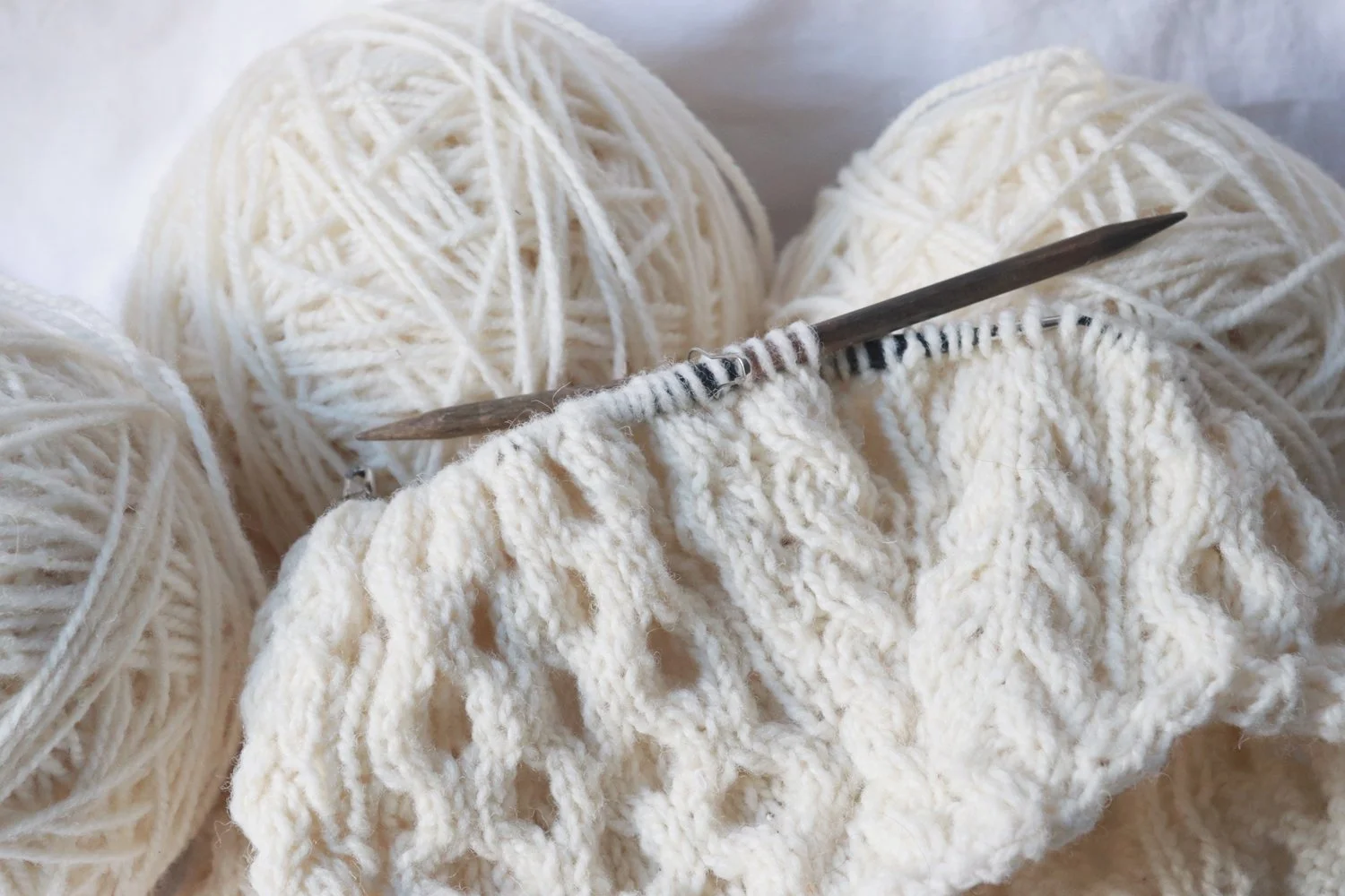 I love to knit cables but I’ve never knit a classic, cream, all-over pattern like this one. It seemed like a good challenge so I offered to knit her a replacement. I found the Billie Pullover by Sari Nordlund and just changed the cable patterns to match the shrunken sweater.