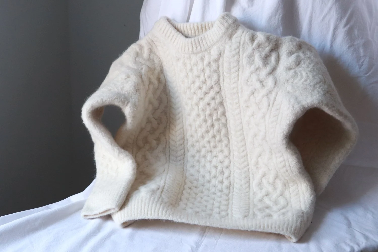 I will say one thing about 100% virgin Irish wool. It shrinks and felts like nothing I’ve ever seen before. The sweater is so thick and it felted so thoroughly that it can almost stand up on its own. Look at those sleeves! It’s the sweater version of the snowsuit scene from A Christmas Story. She was heartbroken when she opened up the dryer. There were tears. She went from the best sweater find to the worst sweater disaster in the span of one hour.