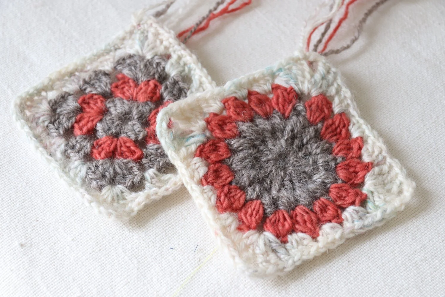 After spinning my first bobbin of yarn, I learned how to ply. This is the result. A wonky but beautiful 2-ply yarn. I really wanted to make something with my very first ball of homespun yarn. The truth is that there really aren’t many projects that use such a small amount. Then I thought of granny squares and I couldn’t get it out of my head. The Agnes Sweater Vest by Bethany Lynne has been on my wish list for a while now and I thought, maybe, just maybe, I would have enough grey yarn for that.