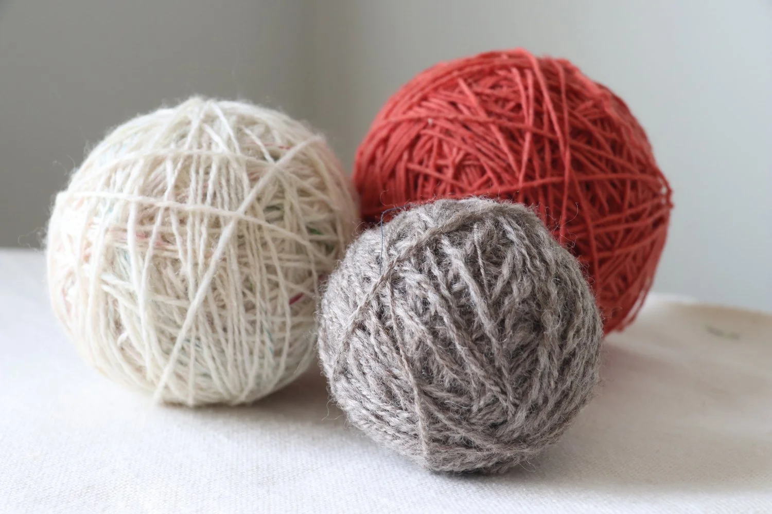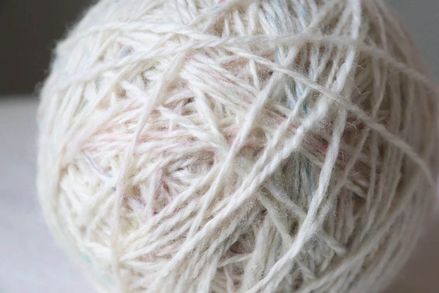 The off-white ball has little flecks of pink and aqua that are hard to see in the photo. They really come alive when put up against the other two yarns.